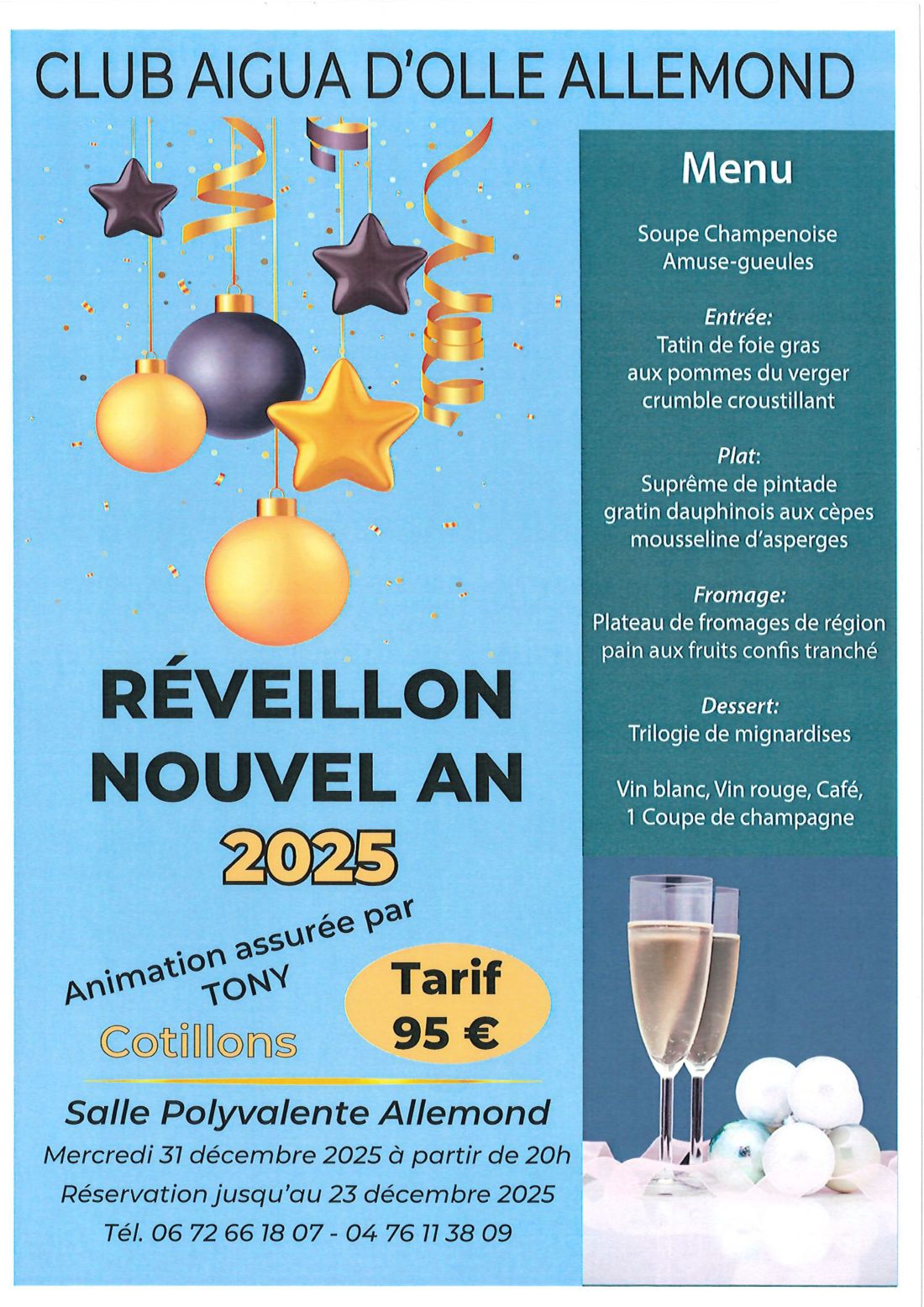Venez célébrer la nouvelle année en compagnie du Club Aigua d’Olle Allemond ! Une soirée festive et gourmande vous attend, animée par Tony.